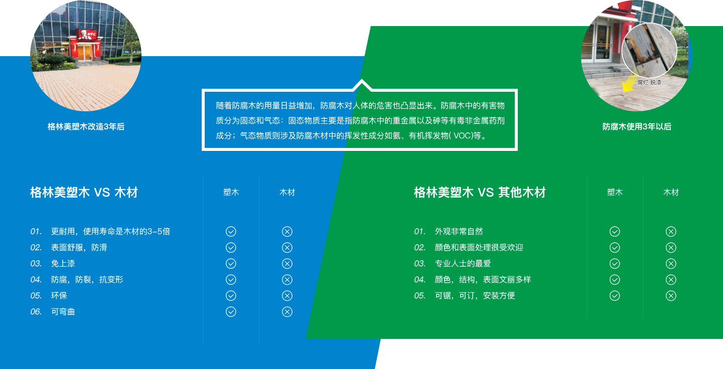 格林美塑木同時具備天然纖維和塑料的優點,耐水性優良,吸水率僅木材的千分之幾,耐候性是木材的3-10倍,剛性和承載性大于全塑材料,而熱脹冷縮性小于鋼材和全塑材料,可加工性優于木、鋼、塑等材料,有多種規格、型號和配件可供選擇,并可隨意定制長度,組裝容易,維護成本最小,可替代原木、塑料、鋼材、鋁合金、水泥及其它材料。