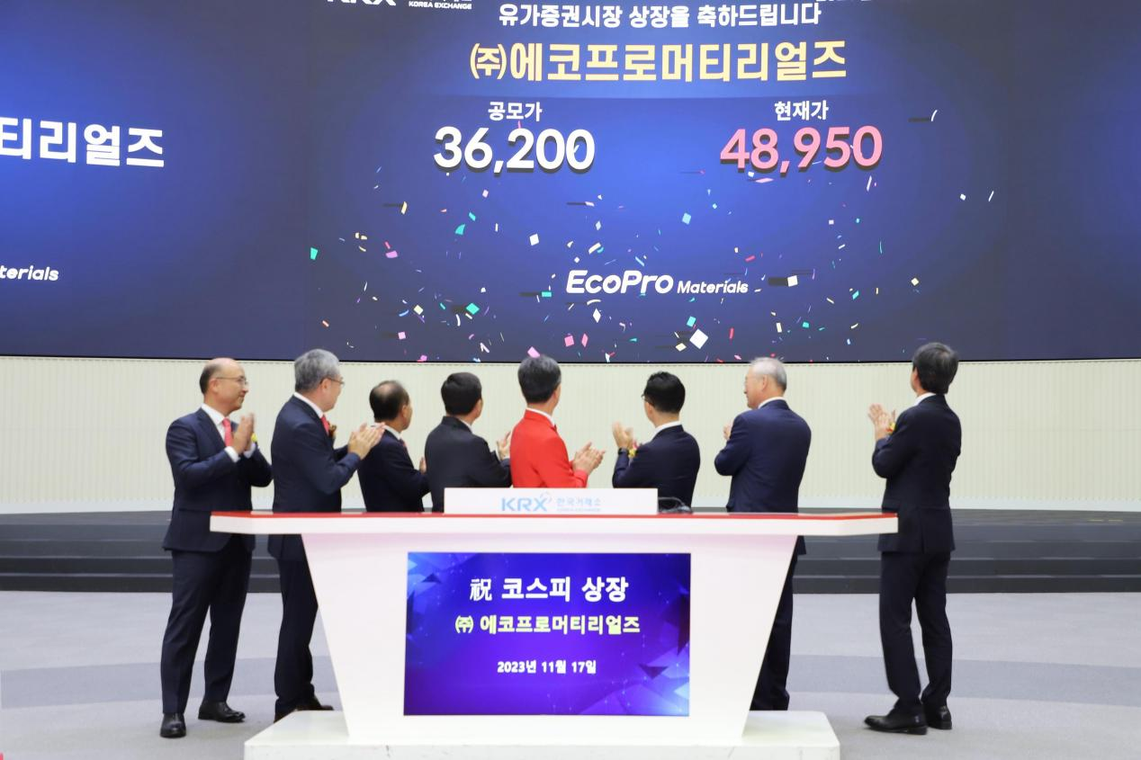 2023年11月17日上午,格林美參股公司韓國EcoPro Materials CO., LTD.(以下簡稱“EcoPro Materials”)成功在汝矣島韓國交易所主板掛牌上市,成為韓國資本市場新能源板塊的第一家前驅體材料上市公司。格林美集團董事長許開華教授受邀出席上市儀式。EcoPro Materials(股票代碼:450080)本次公開發行新股11,580,800股,發行價格為36,200韓元/股。格林美持有其2,022,074股股票,占其發行后總股本的3.00%。