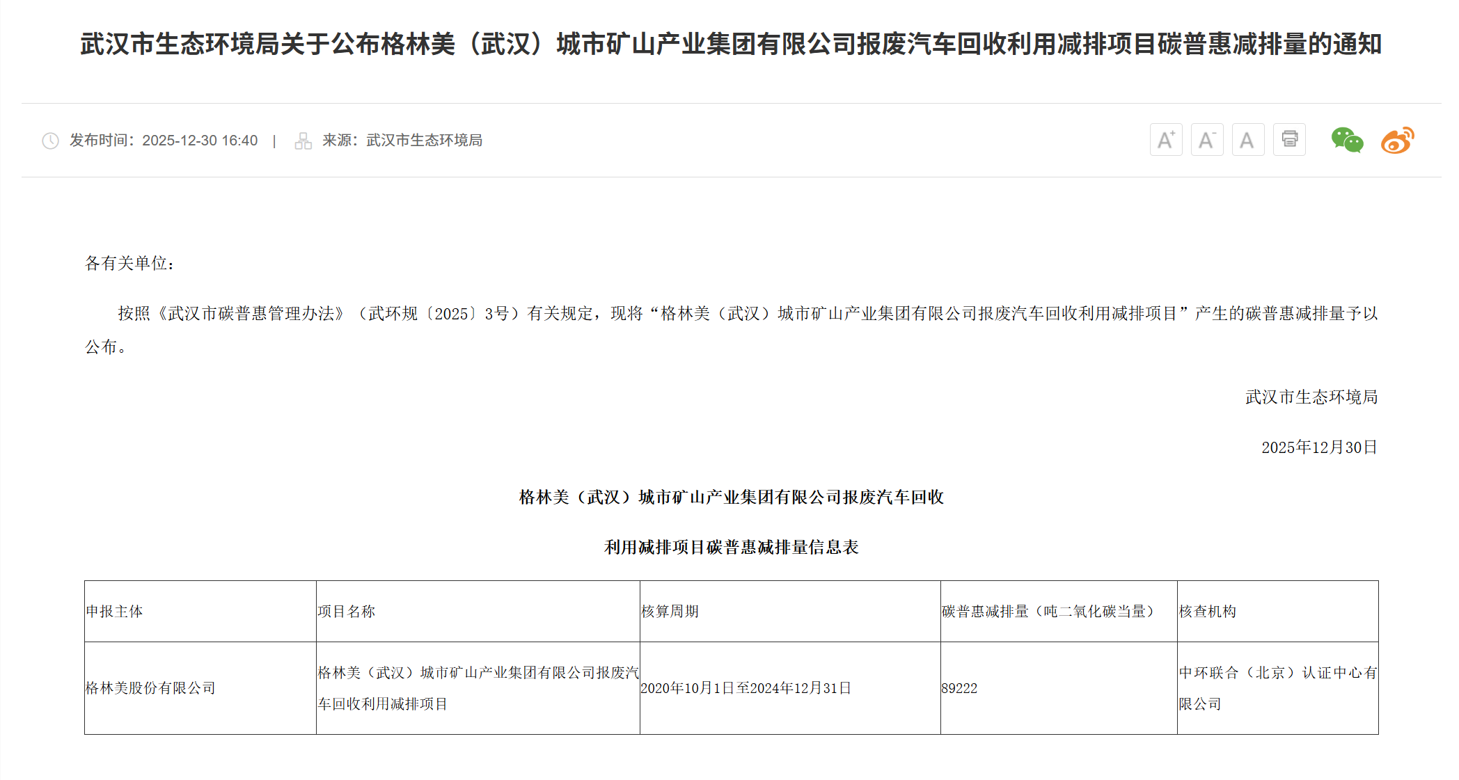 近日,由格林美集團申報的格林美(武漢)城市礦山產業集團有限公司報廢汽車回收利用減排項目碳普惠減排量于武漢市生態環境局官網公布,該項目共簽發89,222噸碳普惠減排量,為全國首批簽發公示的報廢汽車碳普惠減排量,系...