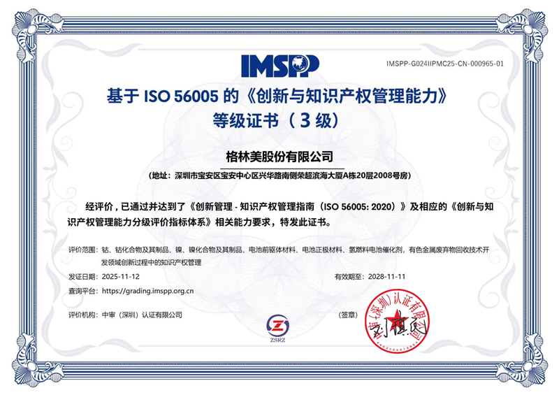 近日,格林美通過ISO 56005創新與知識產權管理能力(3級)以及ISO 56001創新管理體系雙重國際認證,成為全球首家同時擁有海內外雙重創新管理體系認證的新能源材料企業。 截至2025年11月,格林美股份有限公司及核心...