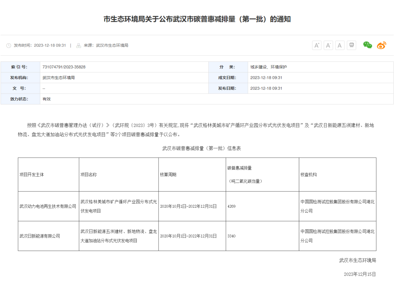 2023年12月18日,武漢碳普惠登記平臺登記了經武漢市生態環境局發布的首批(僅有2家單位)碳普惠減排量項目,共計減排7609噸,其中格林美集團申報的“武漢格林美城市礦產循環產業園分布式光伏發電項目”獲批簽發登記碳普惠...