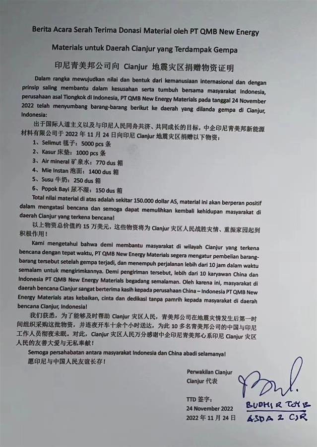 災區情況,時刻牽動著位于印尼中蘇拉威西省莫羅瓦利縣大K島的中資企業——青美邦新能源材料有限公司員工們的心。公司董事長許開華教授號召青美邦同仁竭盡所能為災區人民提供支援,與災區人民同舟共濟、共渡難關。青美邦決定向印尼展玉地震災區捐贈5000條毯子、1000條床墊、770箱礦泉水、1400箱泡面、250箱牛奶等總價值約15萬美元的緊急救災物資。這是青美邦捐贈的第一批物資。青美邦表示,后續將根據需要持續提供必要的支援,直到抗災勝利!