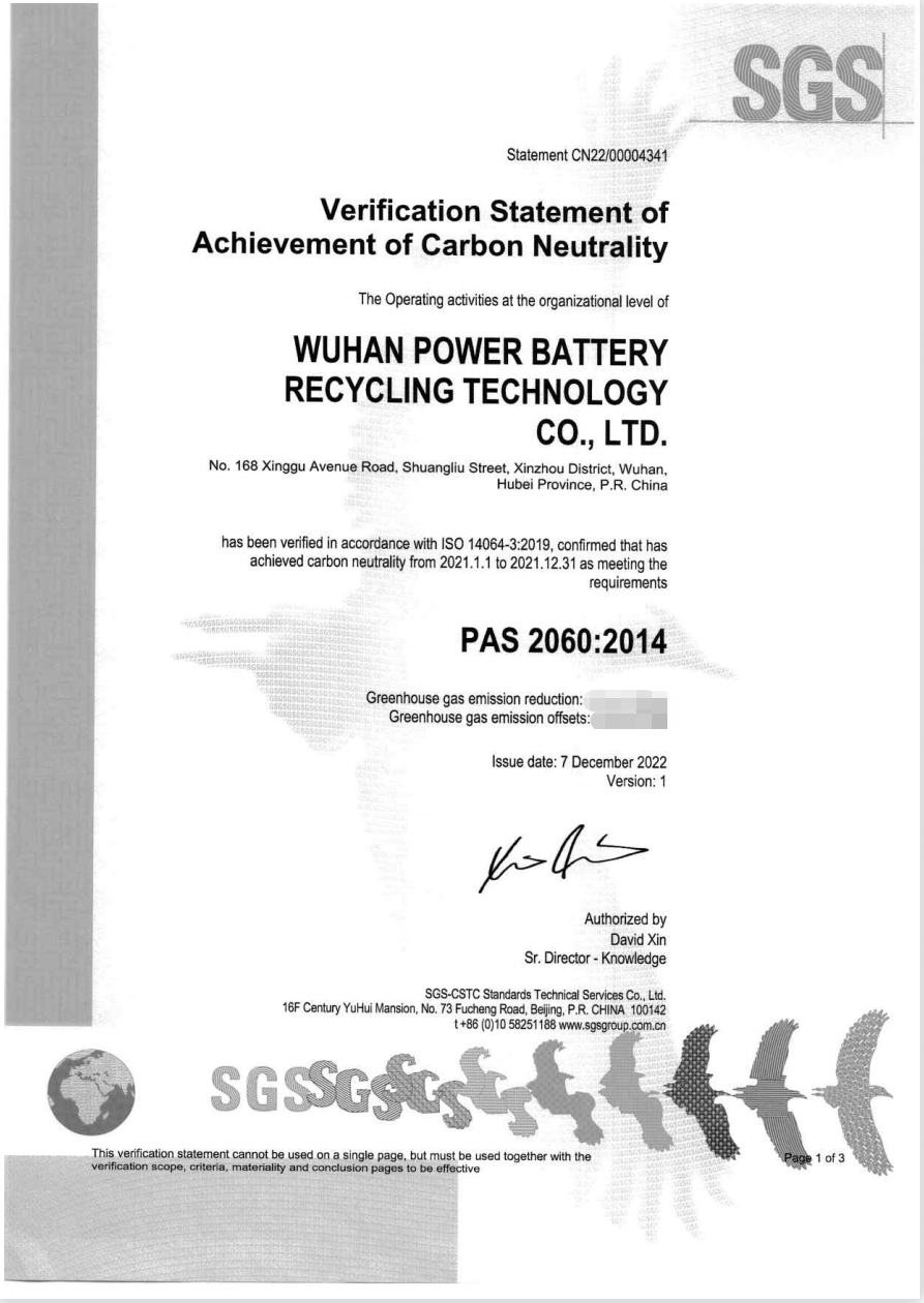 日前,格林美打造的零碳示范園區(qū)——武漢動力電池再生技術有限公司(以下簡稱“武漢動力再生”)正式通過通標標準技術服務有限公司(以下簡稱“SGS”)碳中和認證,獲頒碳中和證書。多年來,武漢動力再生通過近零碳排放園區(qū)試點建設部署,積極打造低碳示范場景,大大降低了溫室氣體排放,園區(qū)實現(xiàn)碳中和。