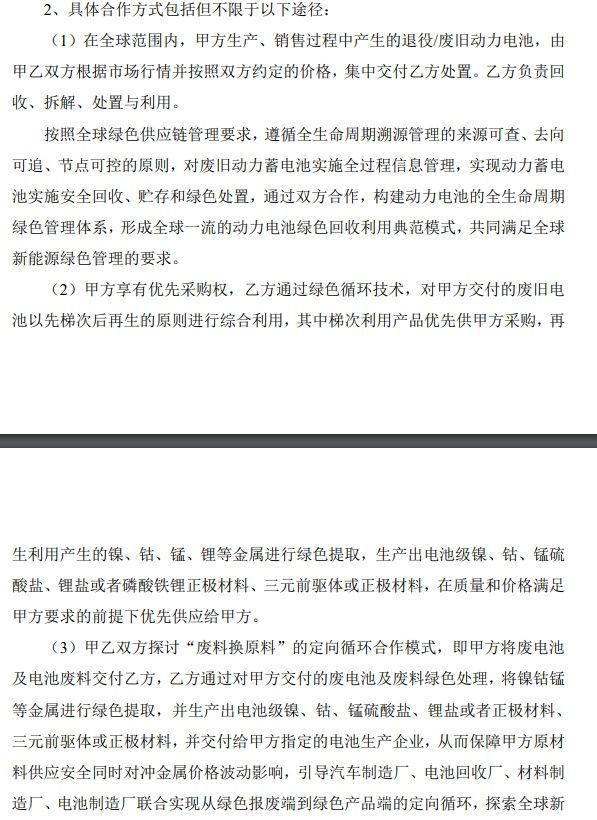 合作方式包括:在全球范圍內(nèi),嵐圖汽車生產(chǎn)、銷售過程中產(chǎn)生的退役/廢舊動力電池,由雙方根據(jù)市場行情并按照雙方約定的價格,集中交付格林美處置。格林美負(fù)責(zé)回收、拆解、處置與利用。格林美通過綠色循環(huán)技術(shù),對嵐圖汽車交付的廢舊電池以先梯次后再生的原則進(jìn)行綜合利用,其中梯次利用產(chǎn)品優(yōu)先嵐圖汽車供采購,再生利用產(chǎn)生的鎳、鈷、錳、鋰等金屬進(jìn)行綠色提取,生產(chǎn)出電池級鎳、鈷、錳硫酸鹽、鋰鹽或者磷酸鐵鋰正極材料、三元前驅(qū)體或正極材料,在質(zhì)量和價格滿足嵐圖汽車要求的前提下優(yōu)先供應(yīng)給嵐圖汽車。