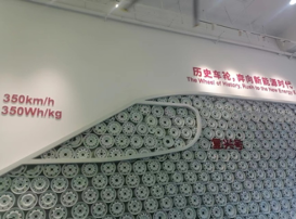 辦公樓內鋪滿整面墻的報廢汽車輪轂拼湊成高鐵車頭 韋璐攝