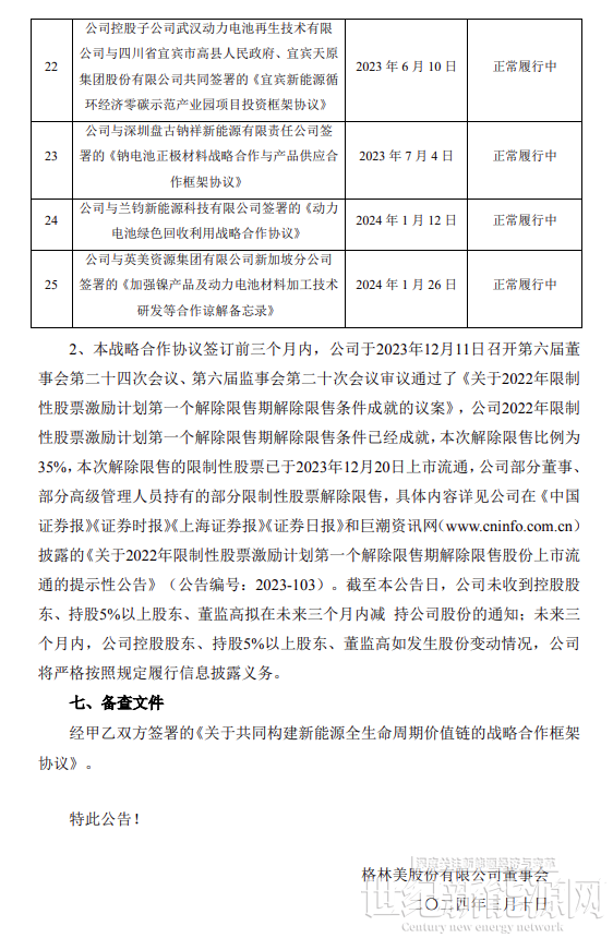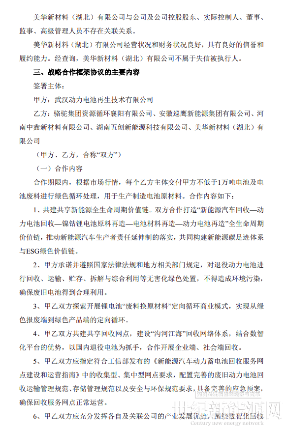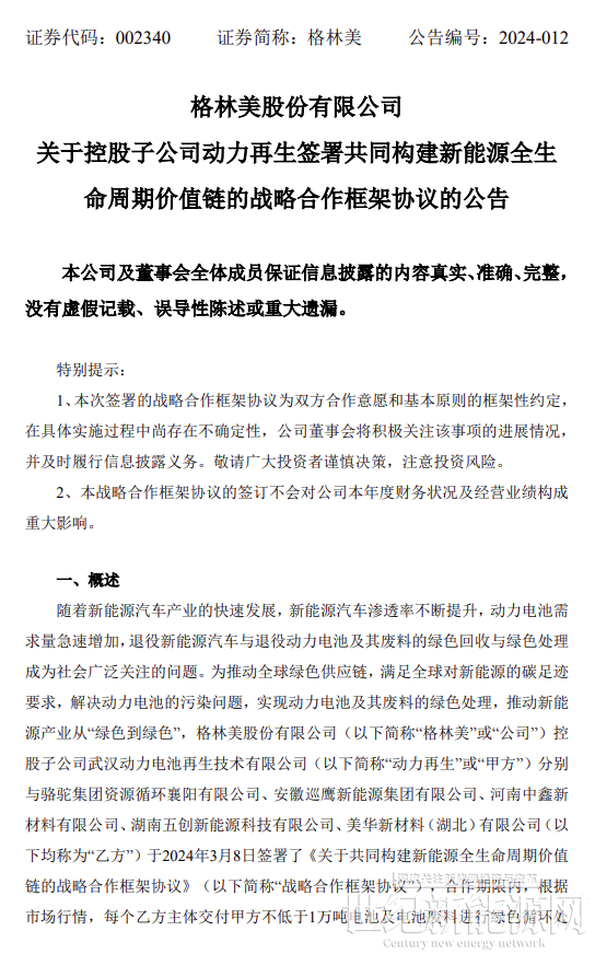 根據公告顯示,格林美股份有限公司控股子公司武漢動力電池再生技術有限公司分別與駱駝集團資源循環襄陽有限公司、安徽巡鷹新能源集團有限公司、河南中鑫新材料有限公司、湖南五創新能源科技有限公司、美華新材料(湖北)有限公司(以 下均稱為“乙方”)于2024年3月8日簽署了《關于共同構建新能源全生命周期價值鏈的戰略合作框架協議》。
