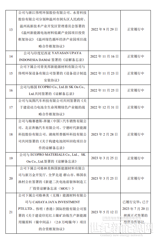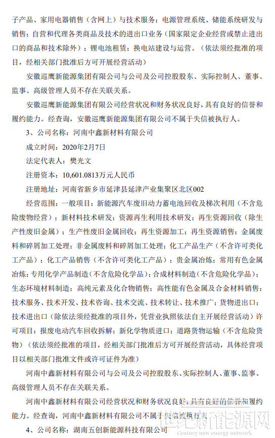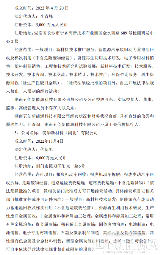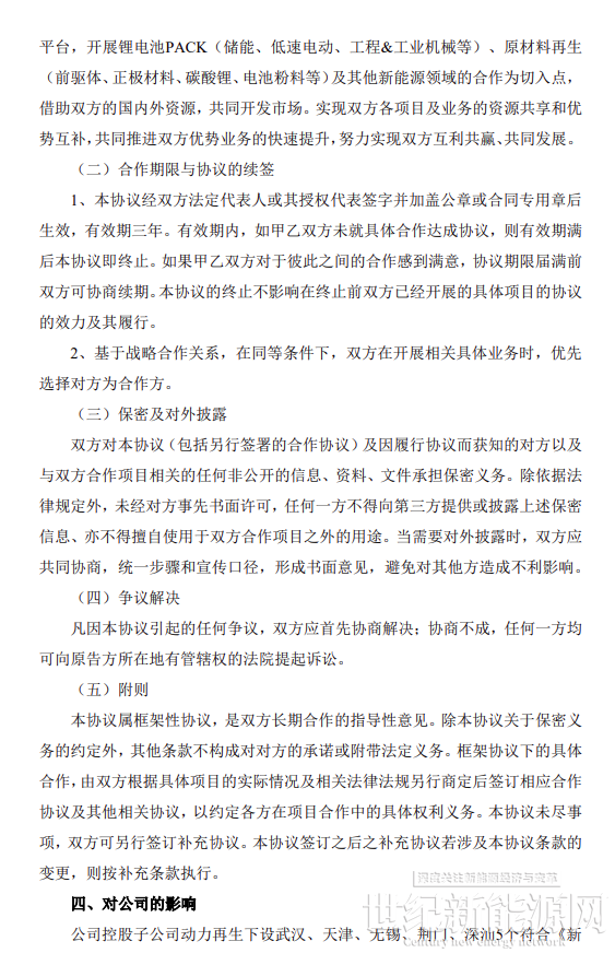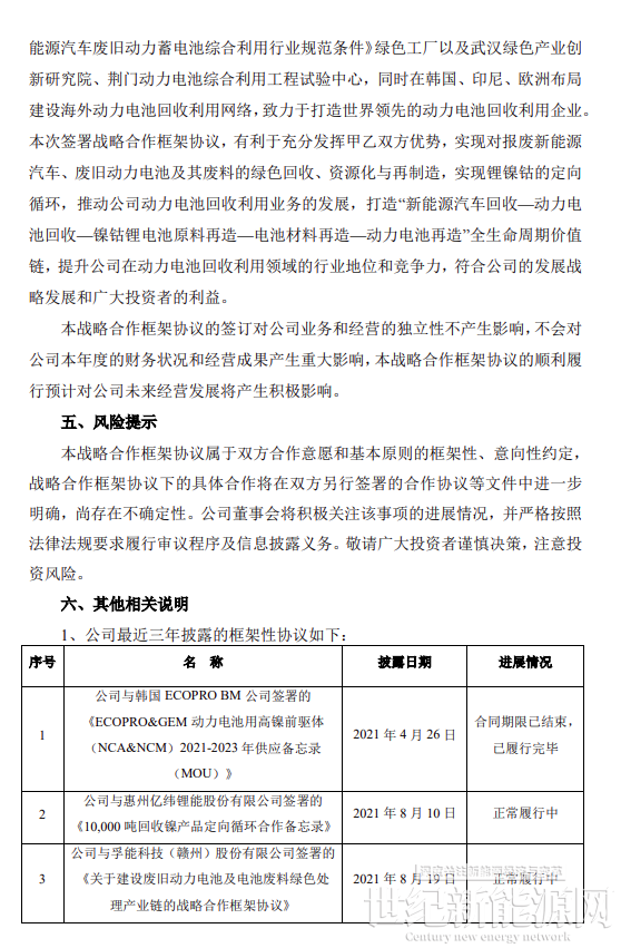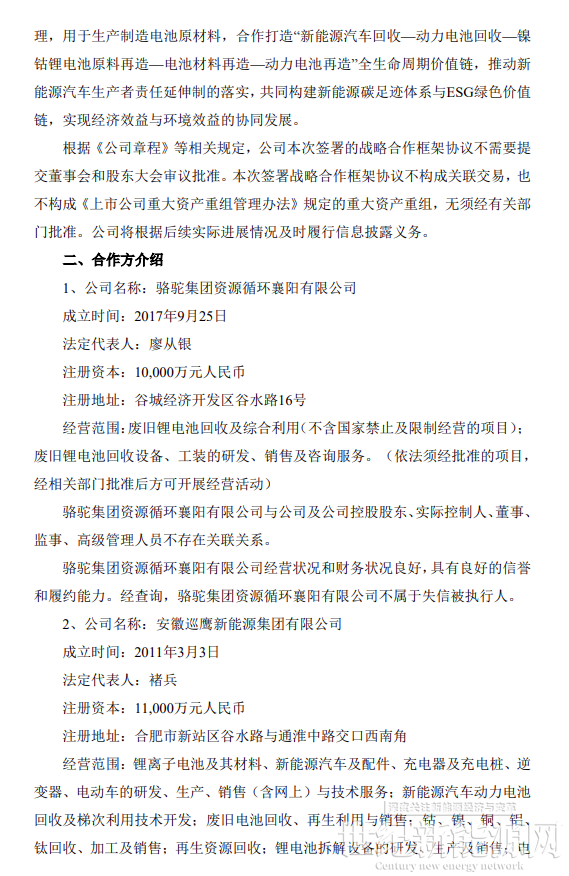 合作期限內,根據市場行情,每個乙方主體交付甲方不低于1萬噸電池及電池廢料進行綠色循環處理,用于生產制造電池原材料,合作打造“新能源汽車回收—動力電池回收—鎳 鈷鋰電池原料再造—電池材料再造—動力電池再造”全生命周期價值鏈,推動新能源汽車生產者責任延伸制的落實,共同構建新能源碳足跡體系與ESG綠色價值鏈,實現經濟效益與環境效益的協同發展。